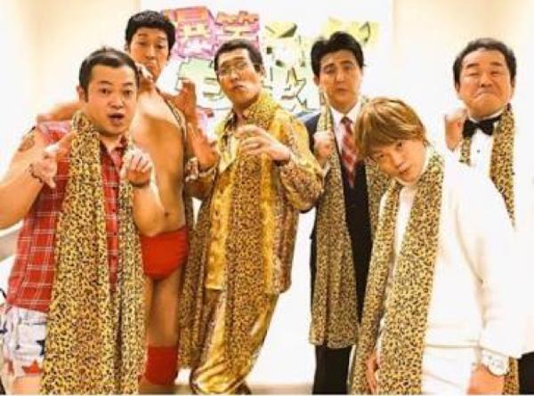 左から、ゲッツ、アントニオ、ピコ太郎、安倍、不倫太郎、誰
