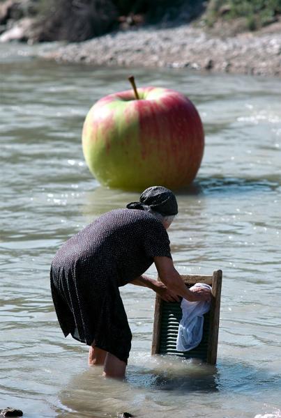 婆さんは川へ洗濯に、爺さんはアダムとイブとりんご狩りへ向かいました。